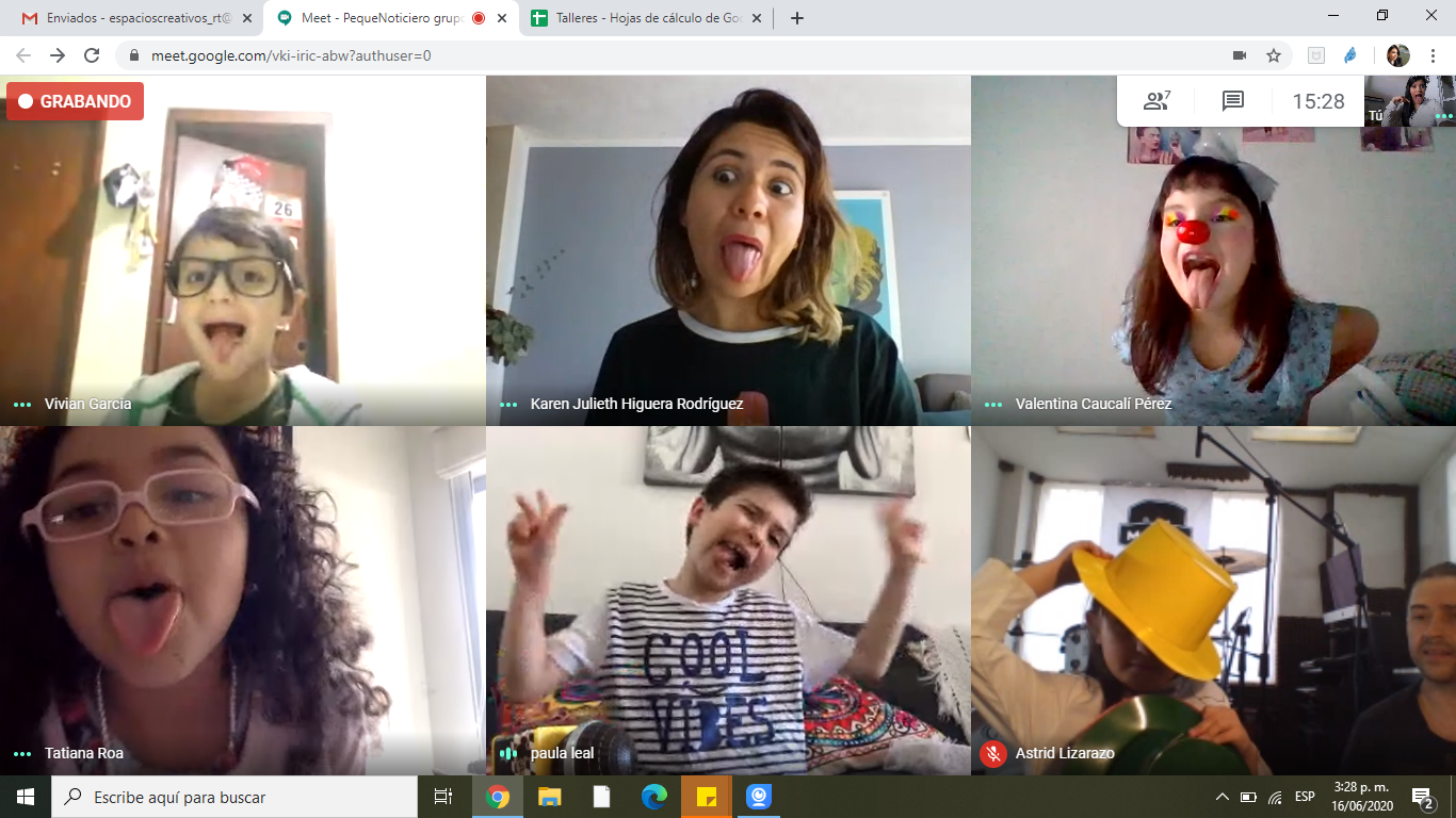 Captura de pantalla del Laboratorio infantil PequeNoticiero que se realizó de forma virtual durante el confinamiento del COVID-19. Su objetivo dar voz a los niños para hablar de la actualidad por medio del juego de rol y la espontaneidad.