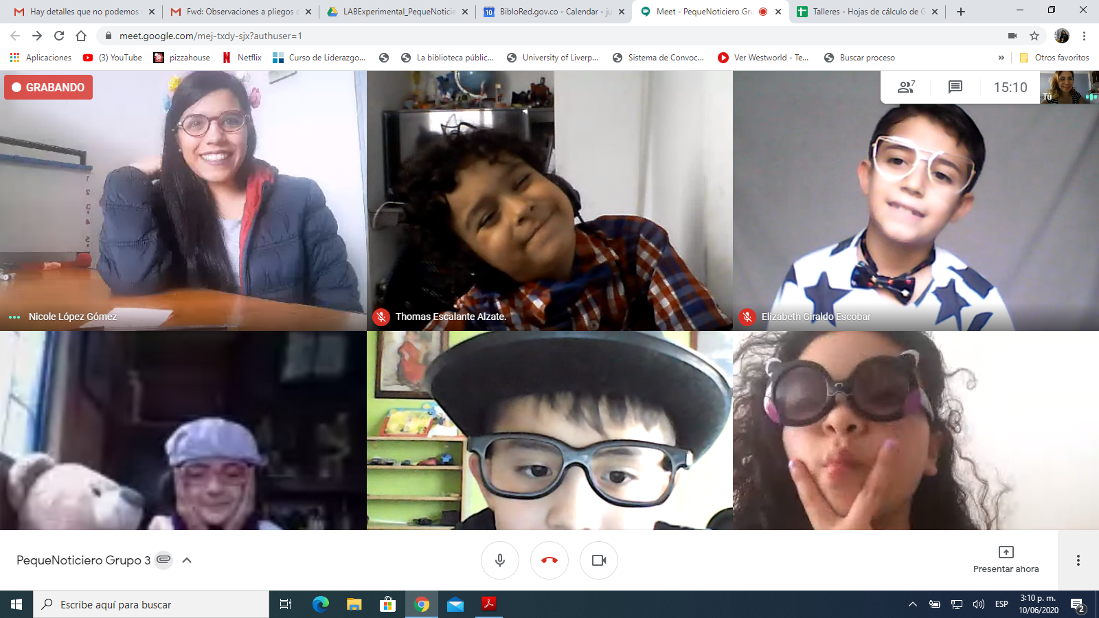 Captura de pantalla del Laboratorio infantil PequeNoticiero que se realizó de forma virtual durante el confinamiento del COVID-19, como parte de las actividades de BibloRed. Su objetivo dar voz a los niños para hablar de la actualidad por medio del juego de rol y la espontaneidad.