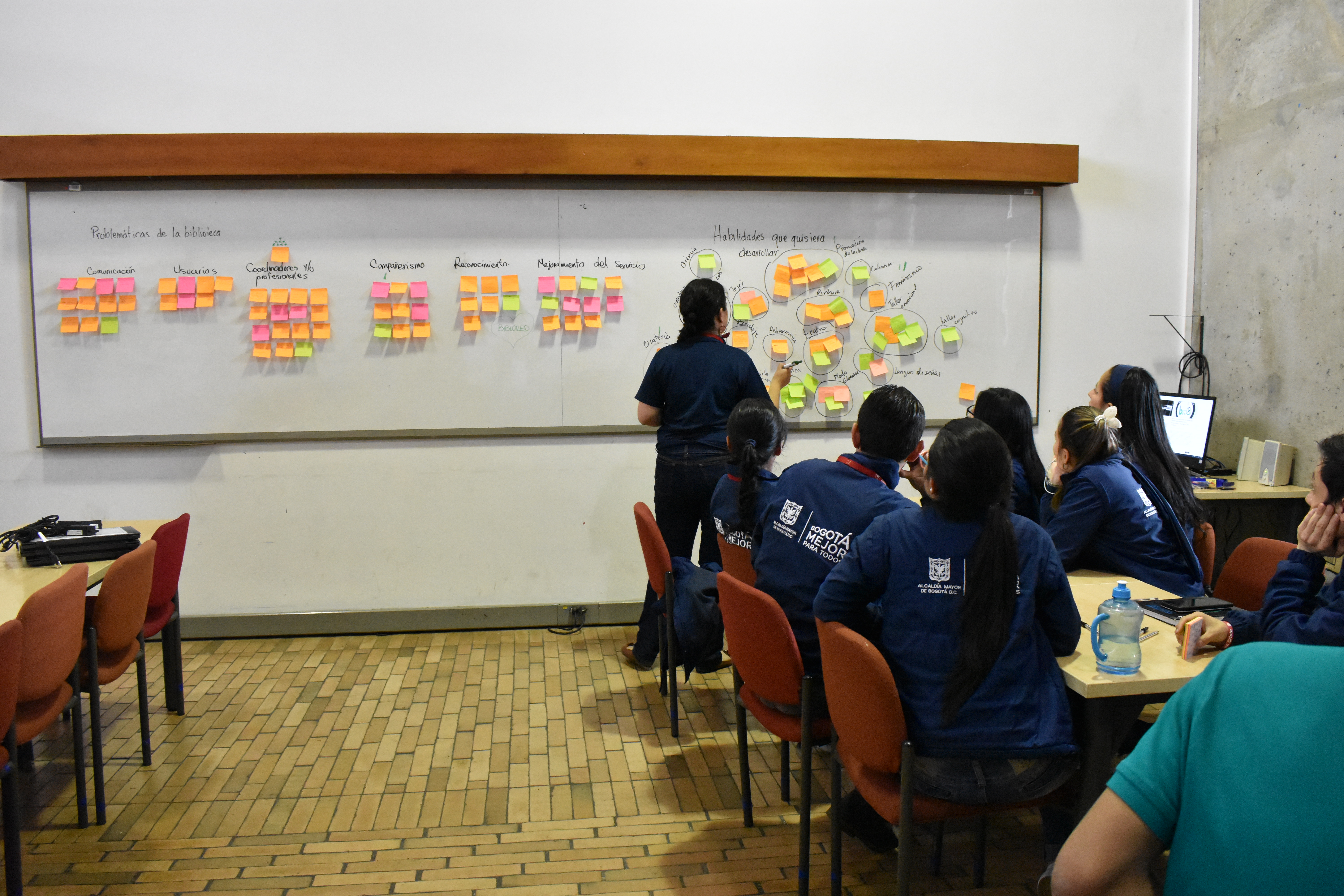 Fotografía tomada durante la ejecución del Laboratorio interno "Co-Red: organización interna con grupos de la Biblioteca Pública El Tintal Manuel Zapata Olivella. Los funcionarios identifican problemáticas que afectan el desarrollo laboral y proponen soluciones para mejorarlo.