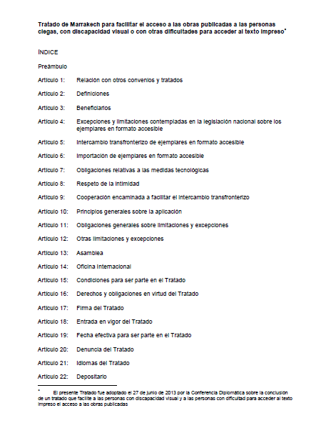 El Tratado, adoptado el 27 de junio de 2013 en Marrakech, forma parte de un cuerpo de tratados internacionales sobre derecho de autor administrados por la OMPI. Posee una clara dimensión de desarrollo humanitario y social, y su principal objetivo es crear un conjunto de limitaciones y excepciones obligatorias en beneficio de las personas ciegas, con discapacidad visual o con otras dificultades para acceder al texto impreso. Disponible en Colecciones Digitales bajo Licencia de Atribución (BY).